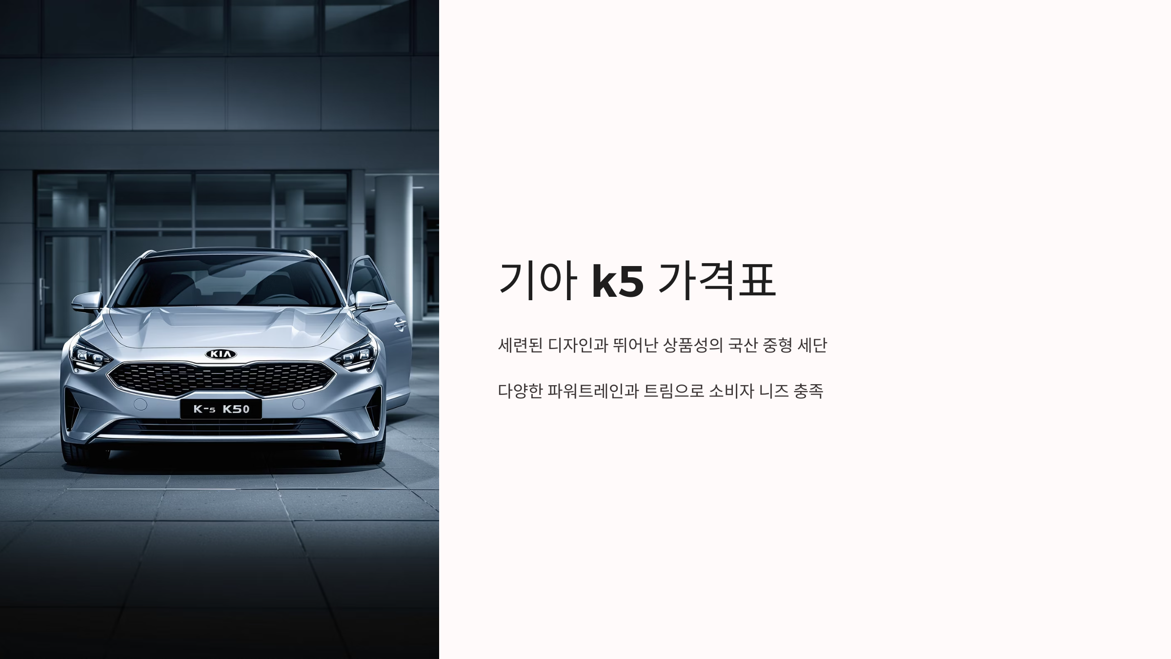 - 프레스티지: K5의 기본 트림이지만, 기본적인 안전 및 편의 사양을 충분히 갖추고 있어 합리적인 가격으로 K5를 경험하고 싶은 분들에게 적합합니다.